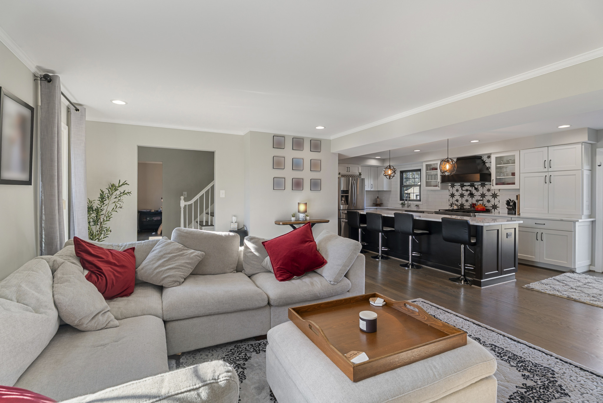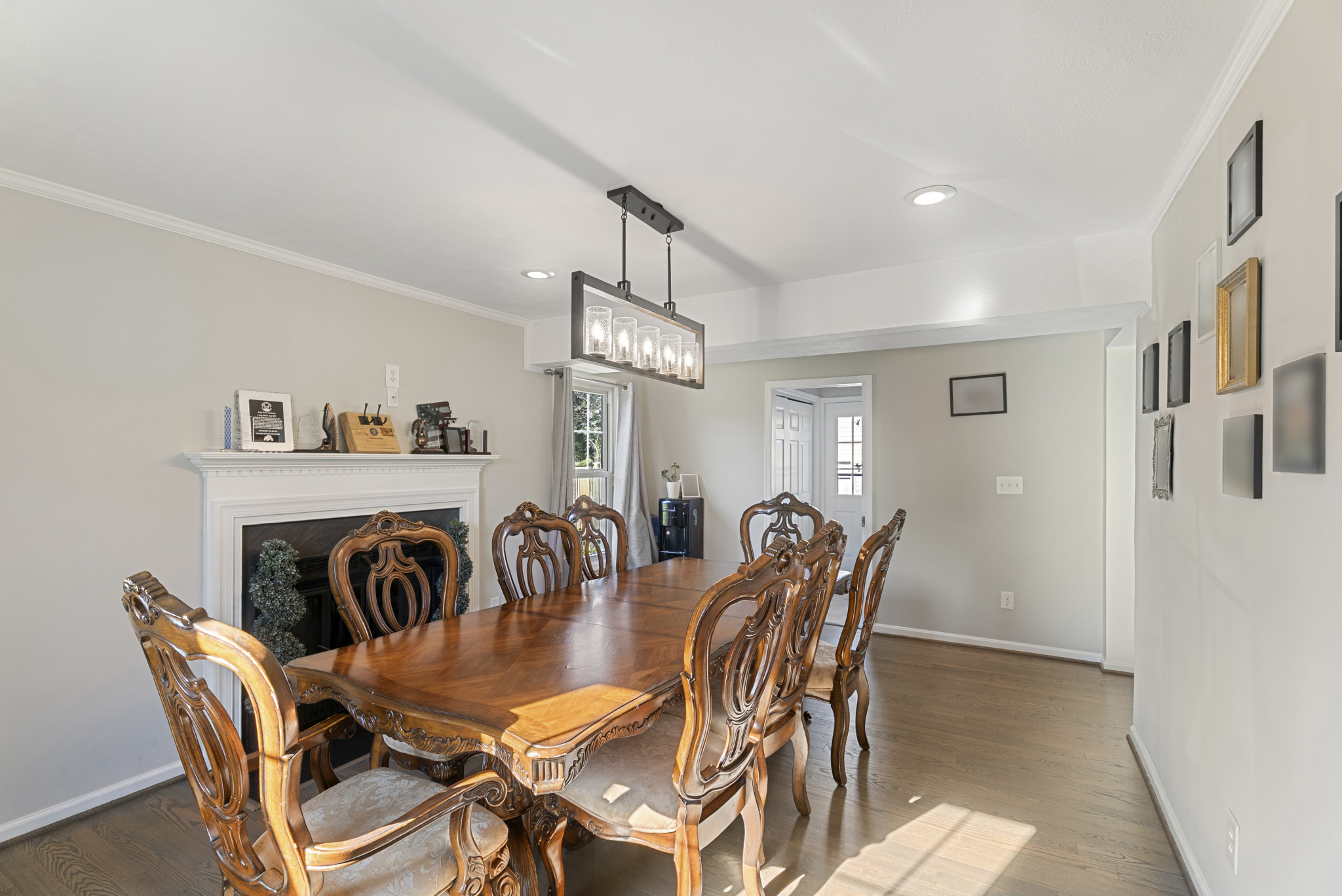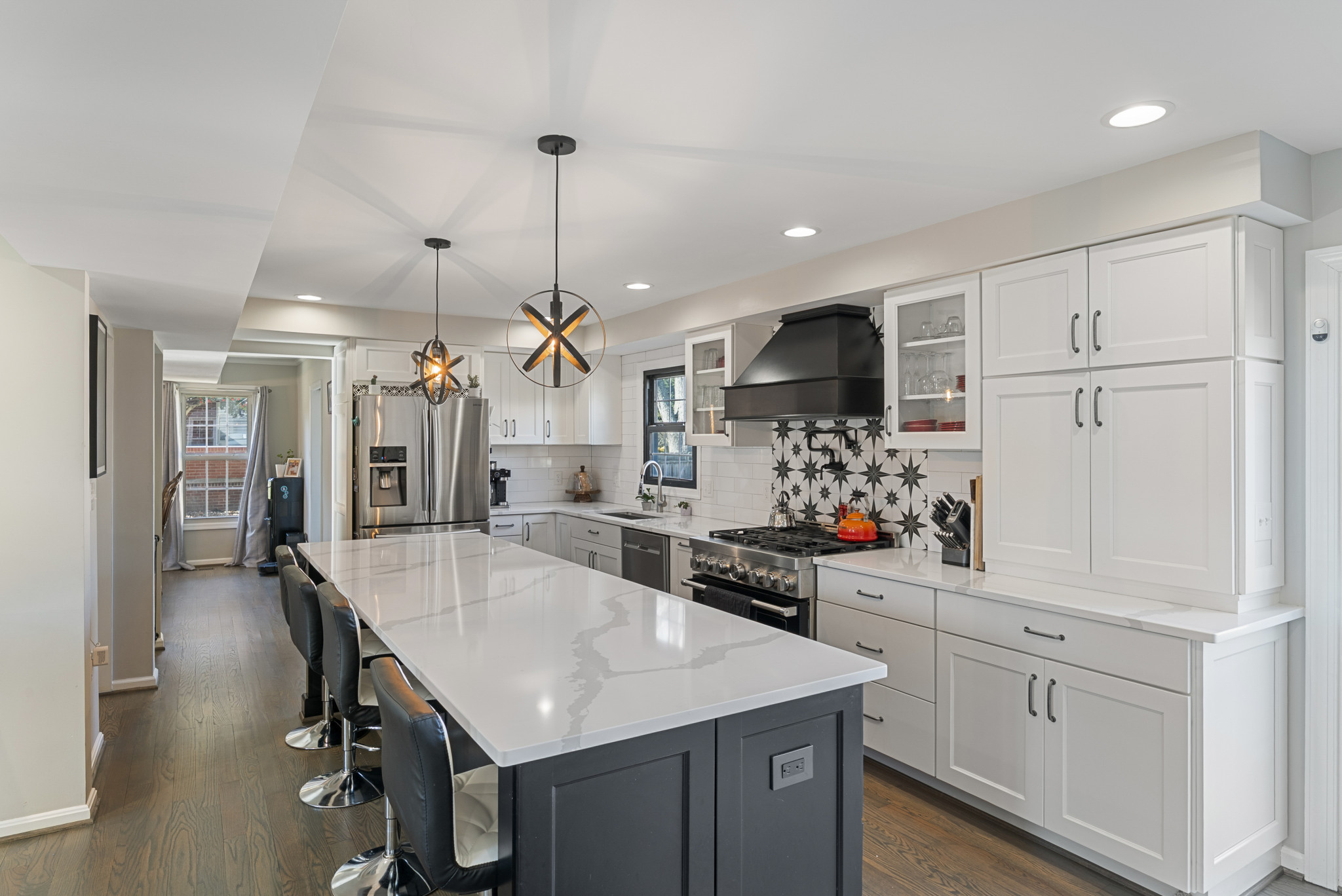 The main level is anchored by a bright, open-concept kitchen, dining, and living area ideal for both everyday living and entertaining. The chef’s kitchen is a true centerpiece, complete with a large island, professional-grade six-burner range, under-counter microwave, quartz countertops, and custom cabinetry with smart drawer-in-drawer storage. A cozy den with a wood-burning fireplace and built-in blower adds warmth and character, while the upgraded laundry room, mudroom, and half bath complete the main level.