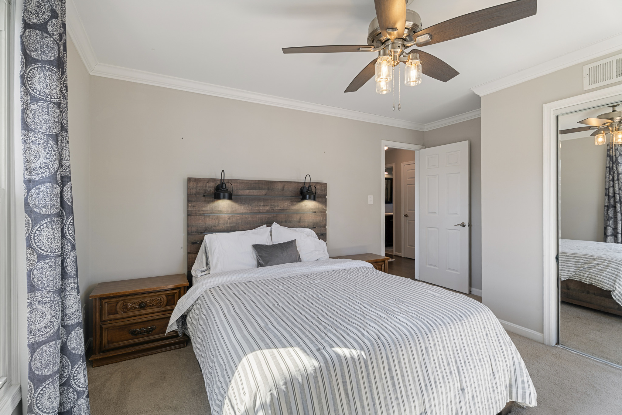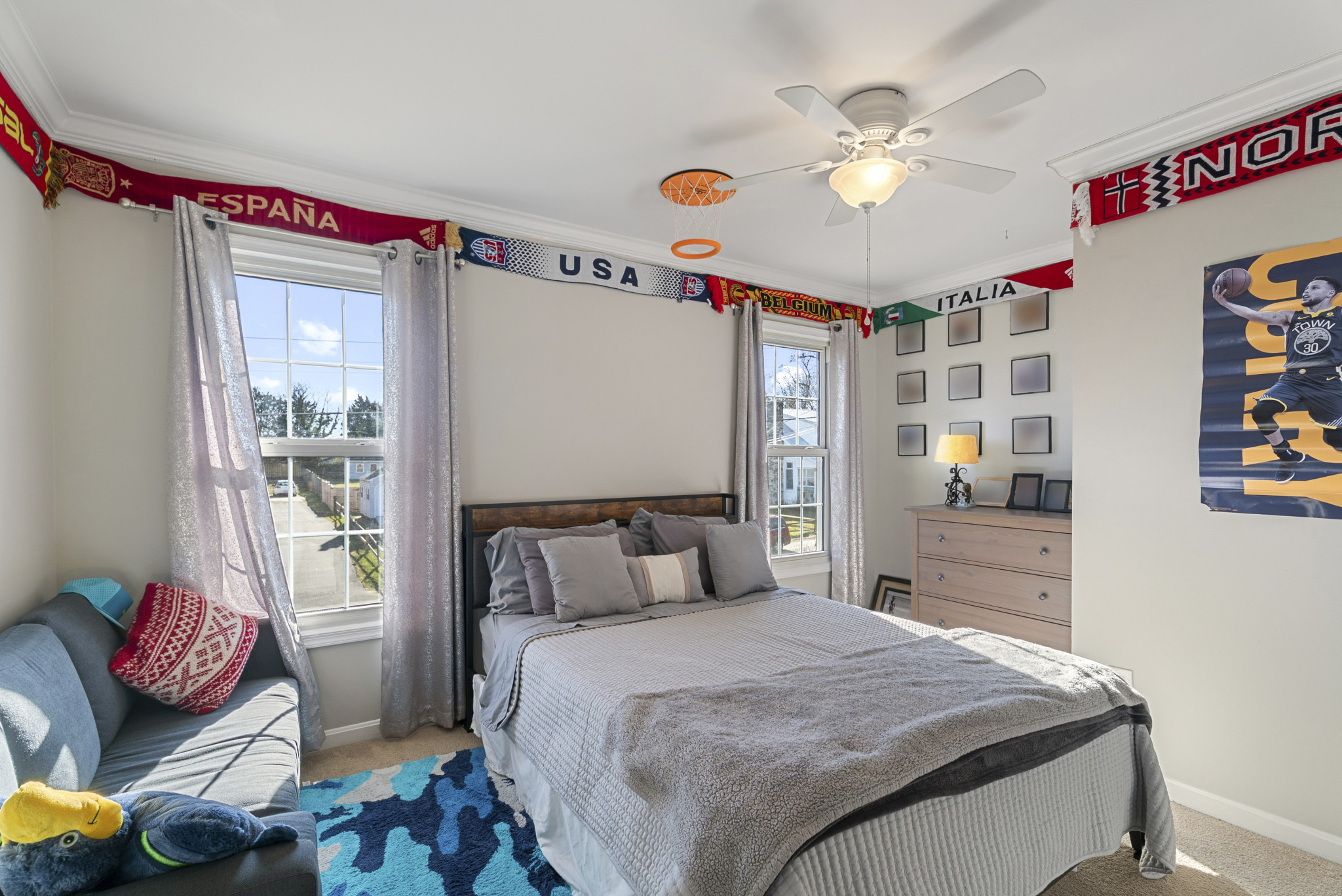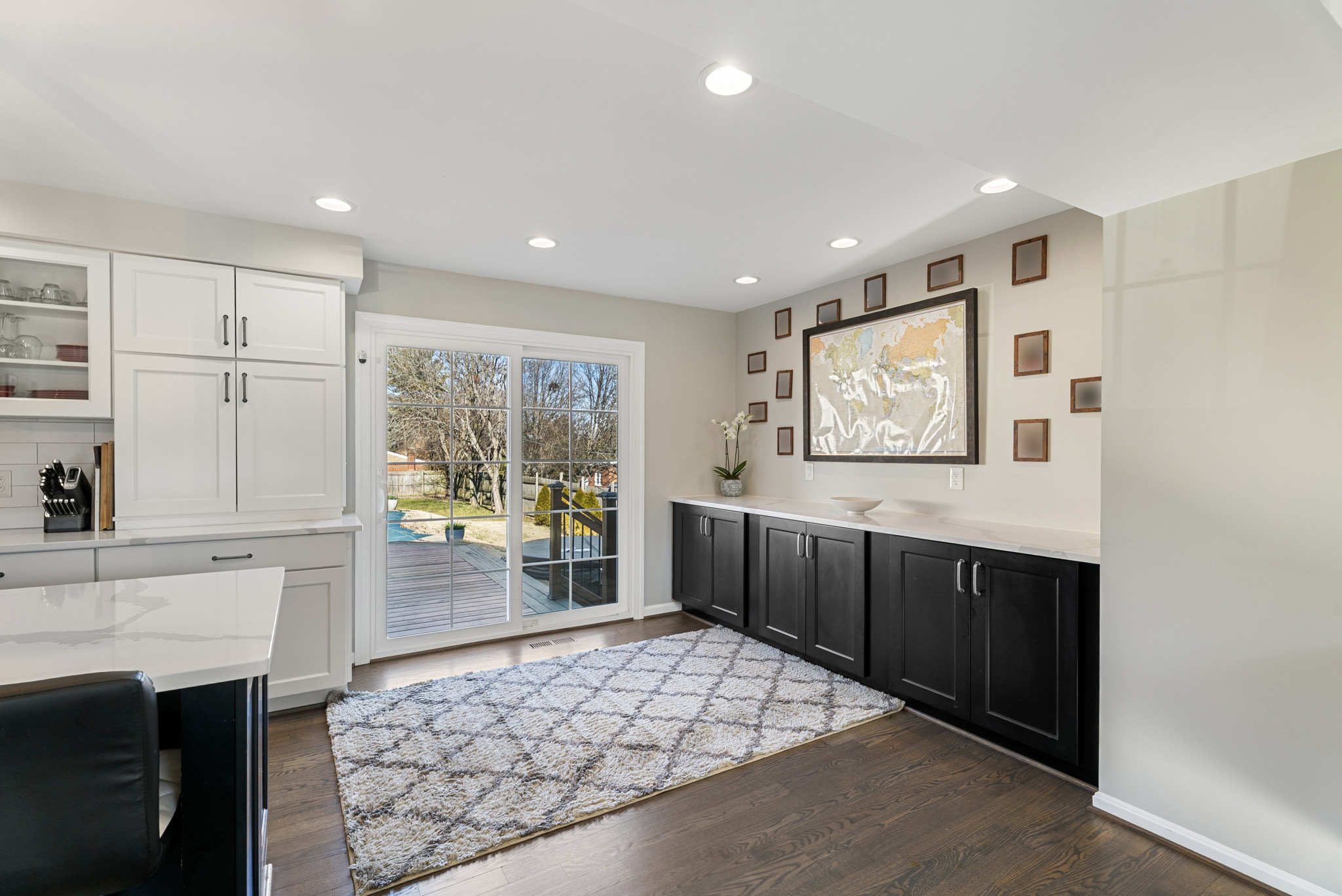 The main level is anchored by a bright, open-concept kitchen, dining, and living area ideal for both everyday living and entertaining. The chef’s kitchen is a true centerpiece, complete with a large island, professional-grade six-burner range, under-counter microwave, quartz countertops, and custom cabinetry with smart drawer-in-drawer storage. A cozy den with a wood-burning fireplace and built-in blower adds warmth and character, while the upgraded laundry room, mudroom, and half bath complete the main level.