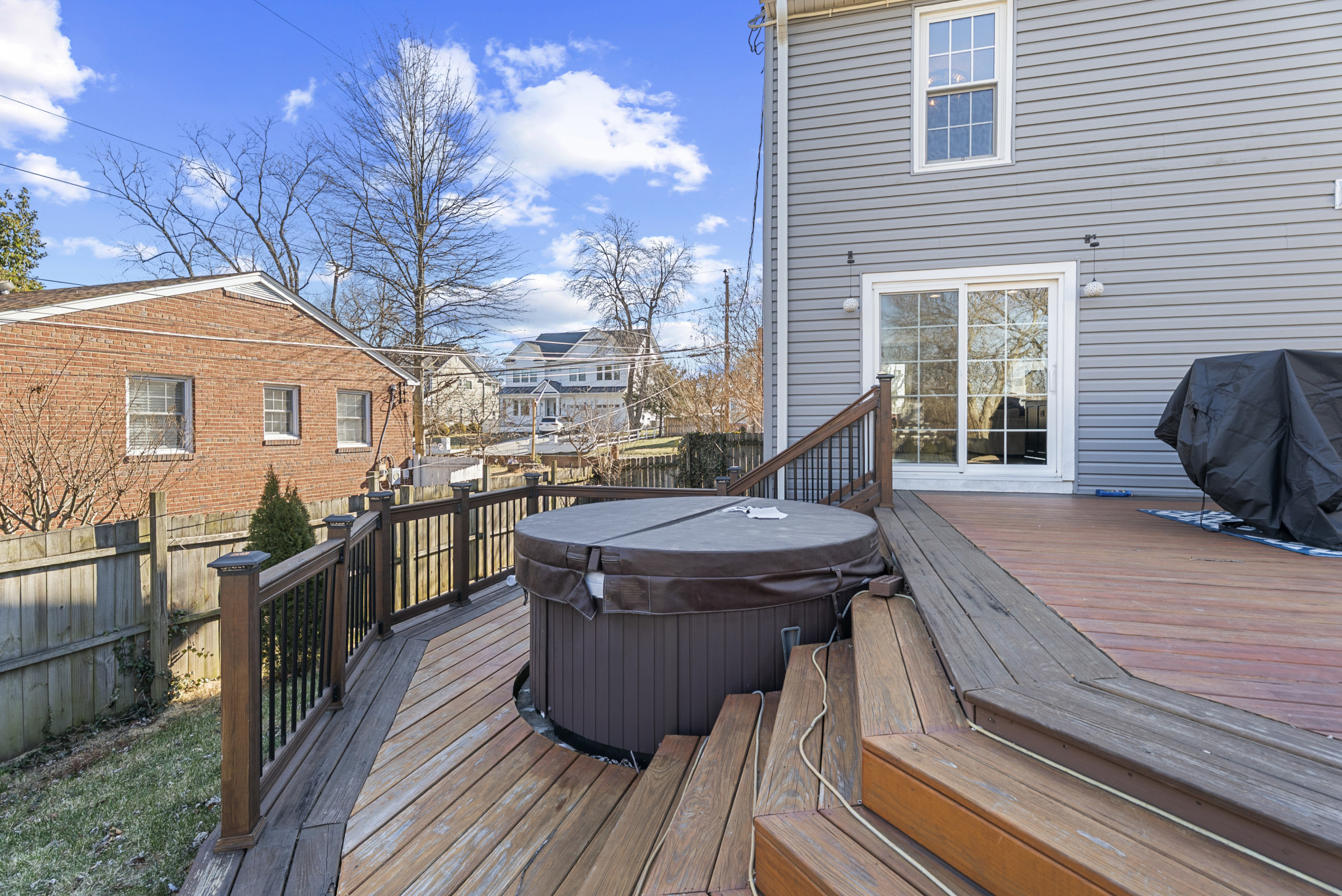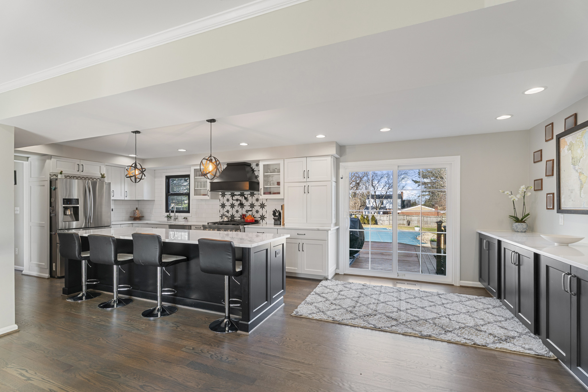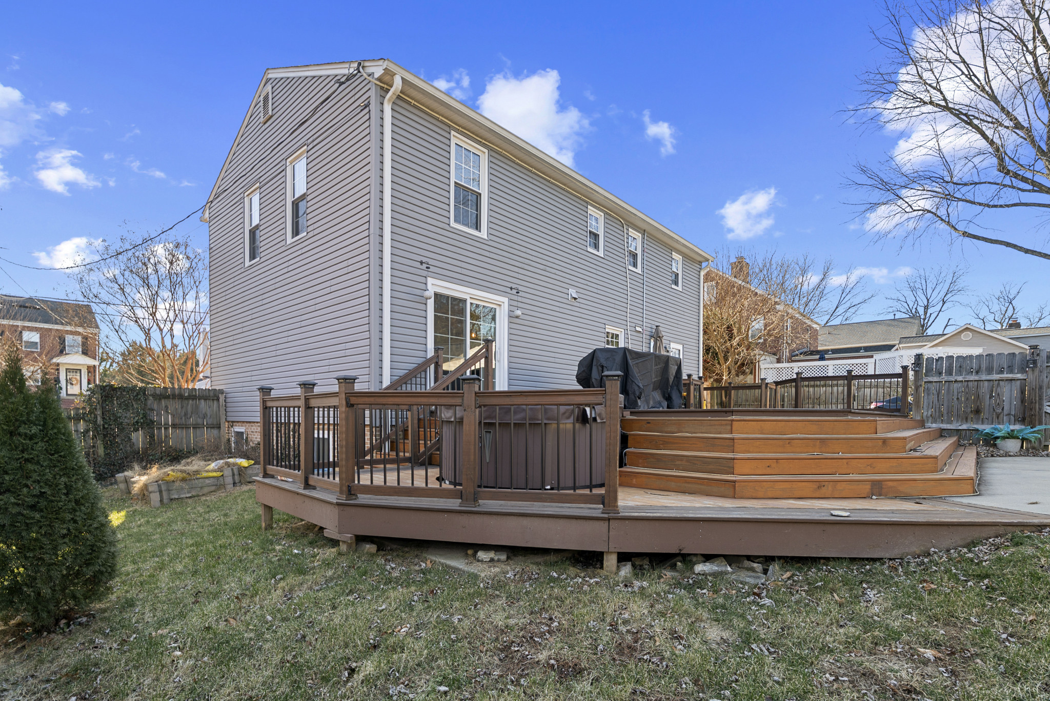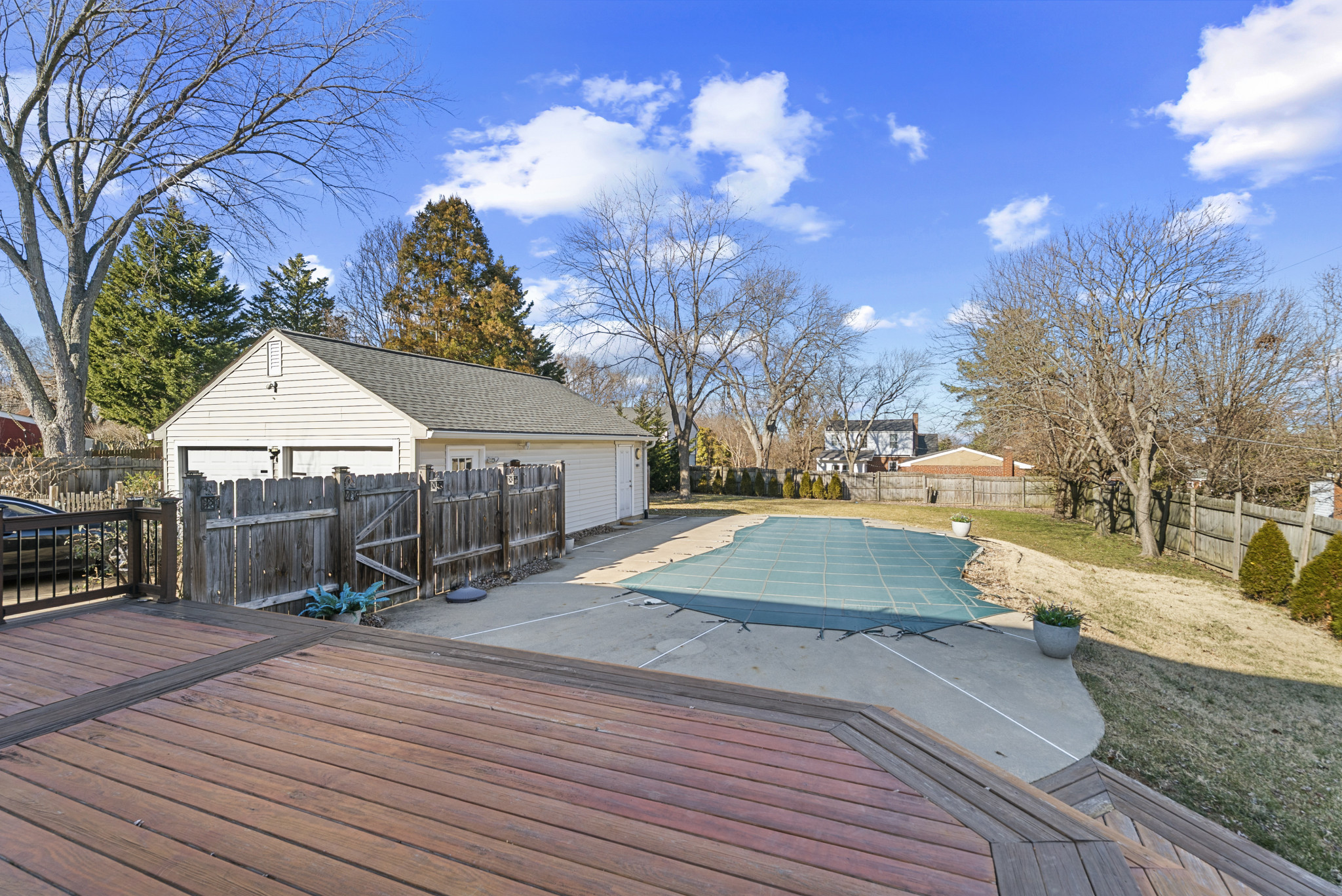 The fully fenced backyard offers a private retreat, highlighted by a custom-designed in-ground heated saltwater pool with an in-pool tanning ledge and seating, an expansive 850-square-foot deck, and a hot tub. A detached garage and pool house, along with a large, flat yard, provide ample space for entertaining, outdoor activities, and recreation.